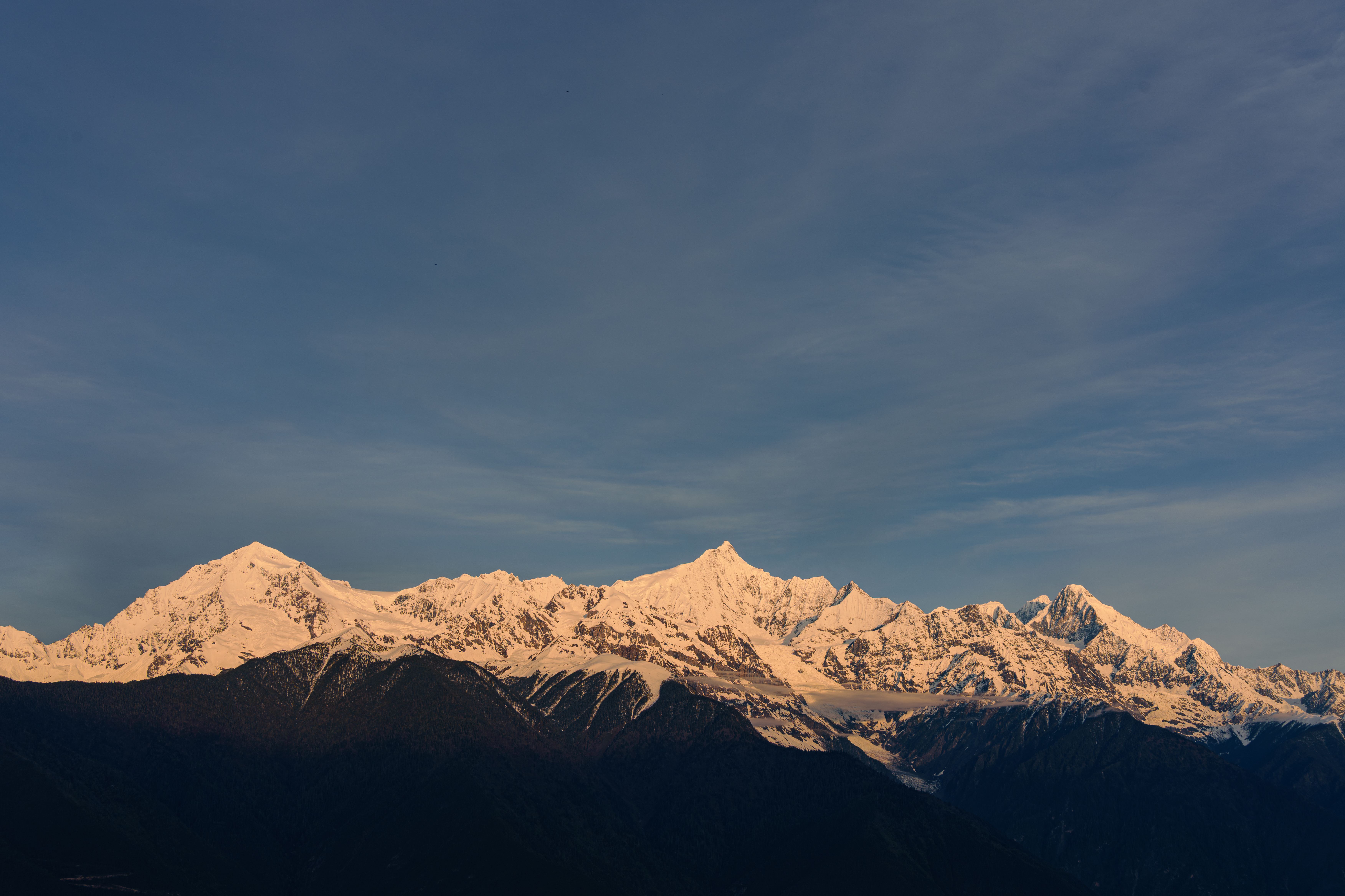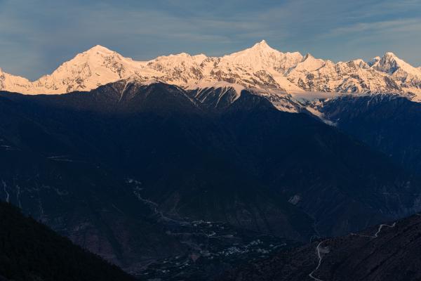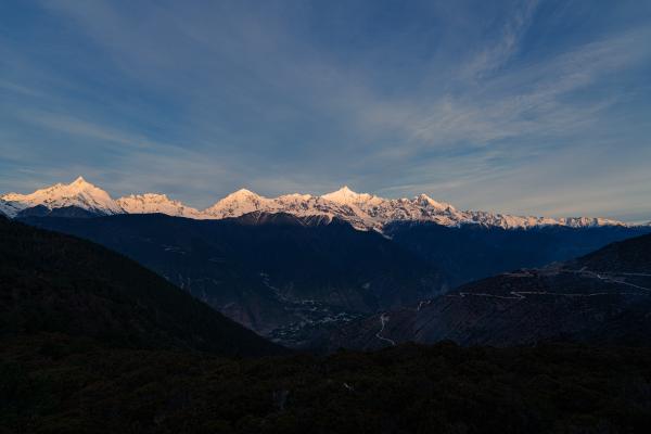 【公认的最美雪山】 梅里雪山被誉为“中国最美雪山”之一,其美丽并非仅在于其巍峨。清晨时分,当第一缕阳光越过地平线,洒在卡瓦博格峰顶时,会呈现出举世闻名的“日照金山”奇观。雪峰在瞬间被染成璀璨的金色,光芒万丈,转瞬即逝,这一幕被视为吉祥与幸运的象征,是无数摄影师和旅行者梦寐以求的视觉盛宴。